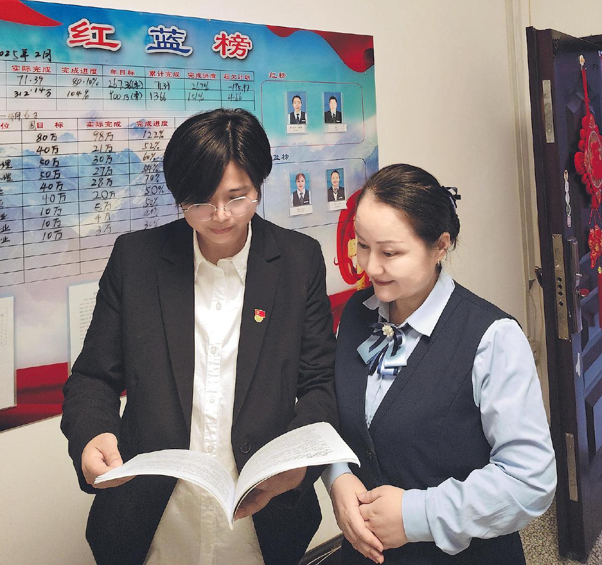 吳麗(左)在網(wǎng)點(diǎn)開展績(jī)效面談。