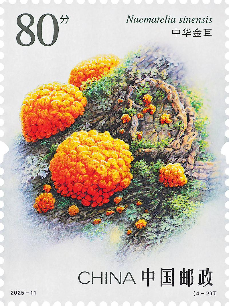 第一枚“變綠紅菇”,設計突出其青翠欲滴的色澤,并融入森林生態(tài)背景,使整體形象兼具自然野趣與美學韻味。第二枚“中華金耳”(如上圖),采用獨特的博物畫風格精準還原金耳獨特的皺紋與柔韌的果凍狀質地。第三枚“松口蘑”,采用細致的筆法刻畫松口蘑菌蓋表面的細微紋理及菌柄的粗壯形態(tài),同時加入松林元素背景,以柔和的光影表現其生長環(huán)境,增強畫面的自然氛圍。第四枚“干巴菌”,以精細入微的線條勾勒干巴菌叢生分枝的復雜結構,輔以簡潔柔和的背景突出主體,再現了其鮮活之態(tài)。
