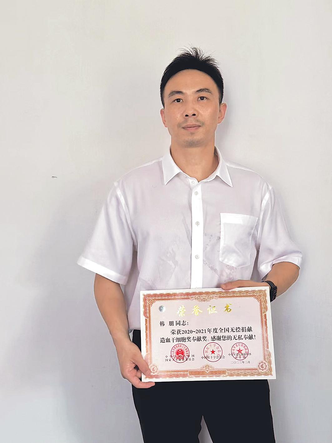 2018年7月,接到岳陽市紅十字會配型成功的通知后,韓朋毅然決然地答應(yīng)捐獻造血干細胞,并保持健康飲食,順利通過了嚴格的體檢。2020年1月,他順利捐獻。他的這份愛心與擔當,再次展現(xiàn)了岳陽郵政員工的高尚品質(zhì)。韓朋表示:“社會是一個大家庭,需要大家來提供溫暖,獻出愛心。能夠以自己的干細胞去挽救一個人的生命,我打心眼兒里高興!”