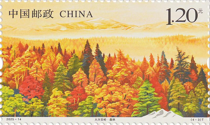 第一枚“濕地”表現(xiàn)了候鳥回歸、杜鵑花開時的濕地風(fēng)光,展現(xiàn)了大興安嶺良好的生態(tài)環(huán)境。第二枚“火山”表現(xiàn)了火山形成的天池風(fēng)光,展現(xiàn)了大興安嶺獨特的地理環(huán)境。第三枚“森林”(見上圖)表現(xiàn)了大興安嶺秋天的森林風(fēng)光,展現(xiàn)了浩瀚原始森林絢麗多彩的景色。第四枚“極光”表現(xiàn)了冬季天空出現(xiàn)絢麗極光的美麗景象,凸顯了高緯度地區(qū)的獨特天象。