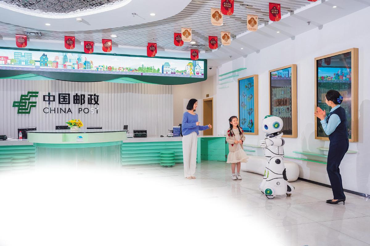 在山東省濟(jì)南市趵突泉郵政支局,圓潤可愛的智能機(jī)器人“小郵”正與小朋友共舞。