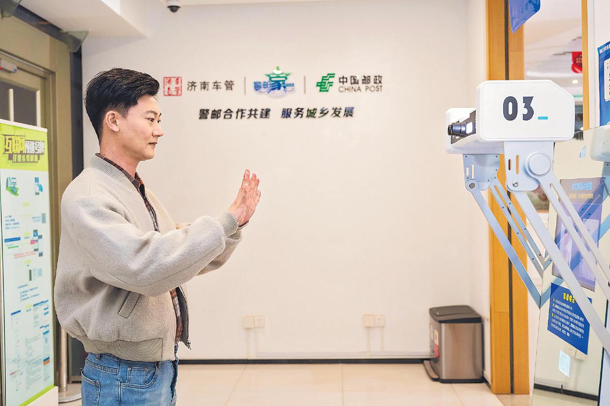 在濟(jì)南市趵突泉郵政支局警郵自助終端前,市民“一站式”高效辦理駕駛證換證手續(xù)。