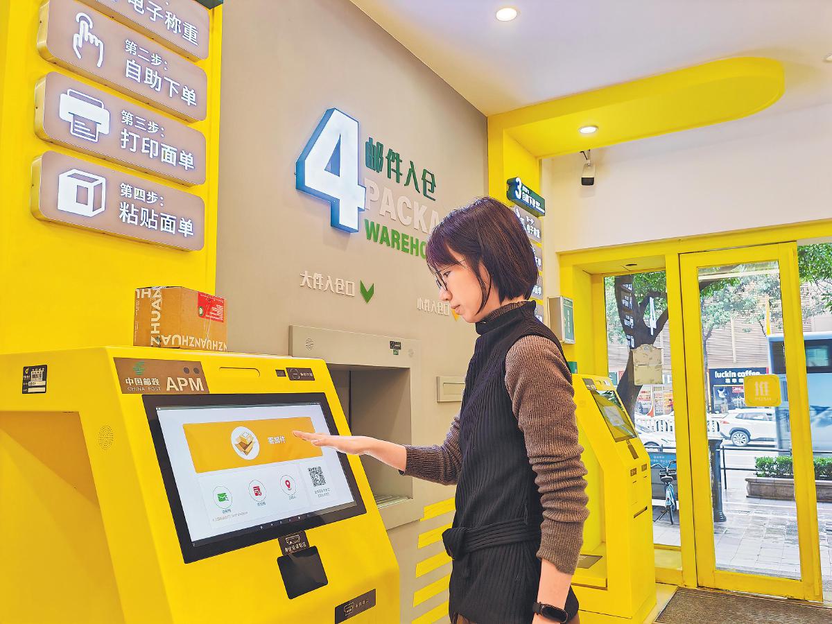 在廣東省深圳市的自助體驗(yàn)式郵局,客戶通過智能設(shè)備輕松完成包裹寄遞。