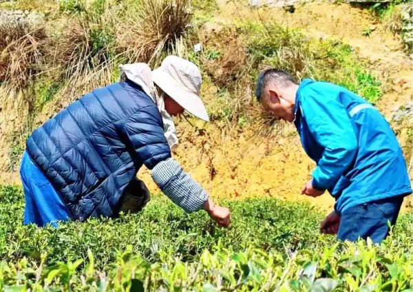 郵政工作人員助茶農(nóng)搶摘春茶。