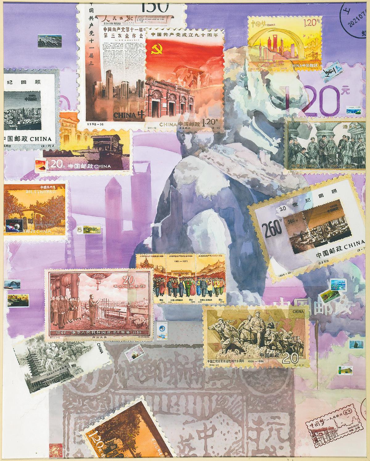 從郵票圖案的細節(jié)還原,到色彩色調(diào)的精準把控,田燕萍始終追求用匠心打磨精品。她借鑒“蒙太奇”電影手法,用繪畫串聯(lián)起不同時代的郵票;背景特意繪制故宮石獅雕像,象征“蘇醒的雄獅”;底色選用紫色,取“紫氣東來”的吉祥寓意。每一處設(shè)計、每一筆勾勒,都藏著她對品質(zhì)的追求。