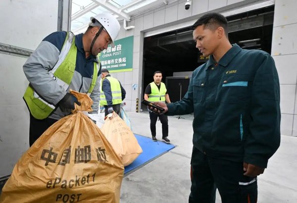 在新疆霍爾果斯國際郵件交換站,中國郵政工作人員(右一)在為即將交換到哈薩克斯坦郵政的郵包掃碼轉(zhuǎn)運(yùn)。據(jù)了解,霍爾果斯國際郵件交換站于2022年7月正式運(yùn)營,以進(jìn)出口物流渠道為支持,為跨境電商產(chǎn)業(yè)鏈上下游提供倉儲和快遞物流綜合解決方案。承運(yùn)中國至中亞多國、俄羅斯以及歐洲國家的出口國際郵件。3年來,累計國際郵件交換量2026噸(9月11日攝)。新華社記者 李賀 攝