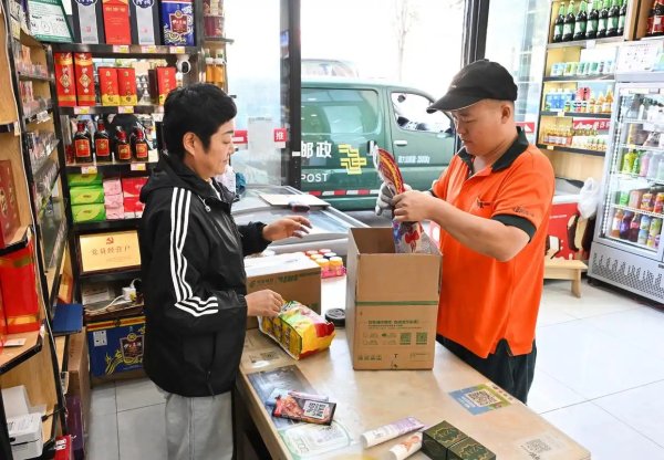 在新疆伊犁州察布查爾錫伯族自治縣華美樂家超市郵政代投點,超市店主周艷蕓在協(xié)助村民那比江·庫爾班江(左)取代投的快遞。近年來,伊犁州郵政分公司在村級超市、商店等場所建立代投點670余個,讓村民不出村便能收取快遞,給當(dāng)?shù)馗髯迦罕妿肀憷?月8日攝)。新華社記者 李賀 攝