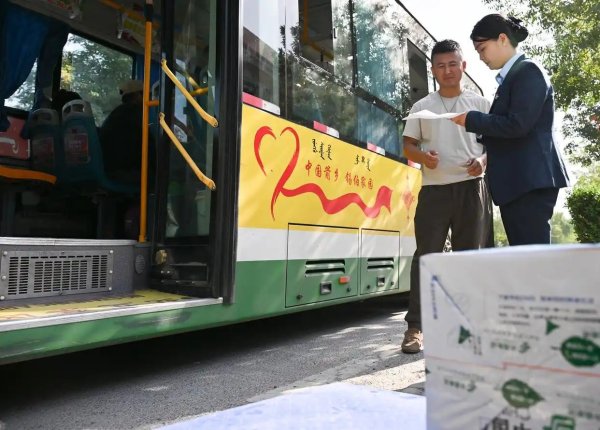 新疆伊犁州米糧泉鄉(xiāng)米糧泉村郵政所工作人員(右)在同公交車司機(jī)交接郵件。近年來,伊犁州郵政分公司通過和公交公司合作,利用公交車的冗余載能將郵件投送到村級郵政所,為當(dāng)?shù)馗髯迦罕妿肀憷?月8日攝)。新華社記者 李賀 攝
