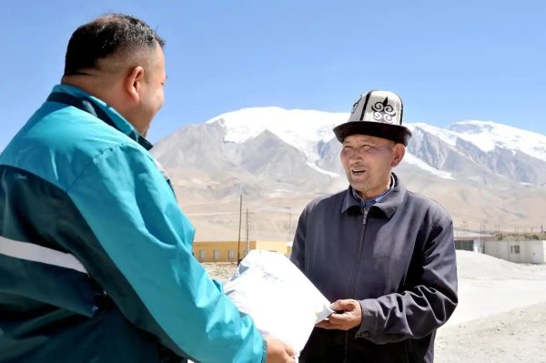 投遞員阿克阿不都賽米·賽買提(左)把包裹送到新疆克孜勒蘇柯爾克孜自治州阿克陶縣布倫口鄉(xiāng)布倫口村夏迪別克·排爾慢手中。郵路延伸到雪山腳下,讓生活在邊疆的各族民眾也能享受到和城市居民一樣快捷方便的郵政服務(wù)(9月9日攝)。新華社發(fā)