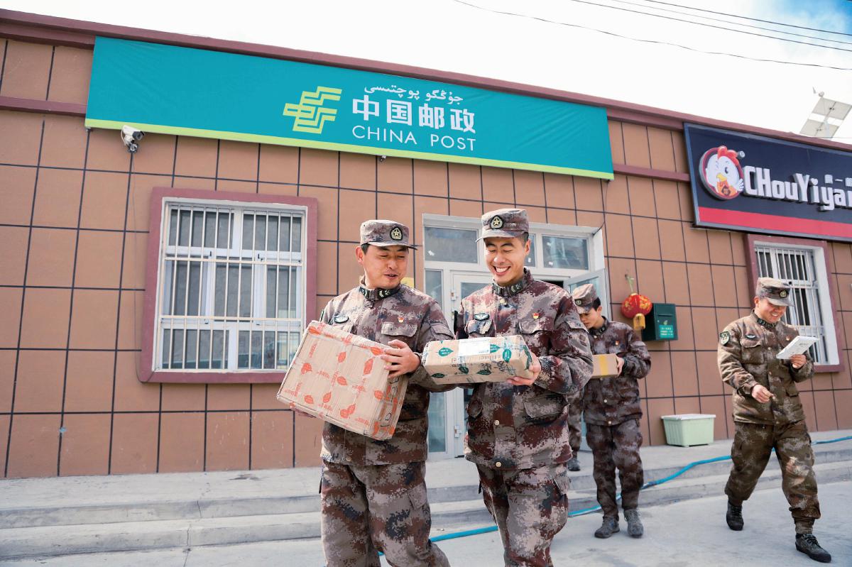 直達新疆葉城縣三十里營房地區(qū)的郵路開通后,駐地部隊官兵從郵政服務點高興地取出包裹。