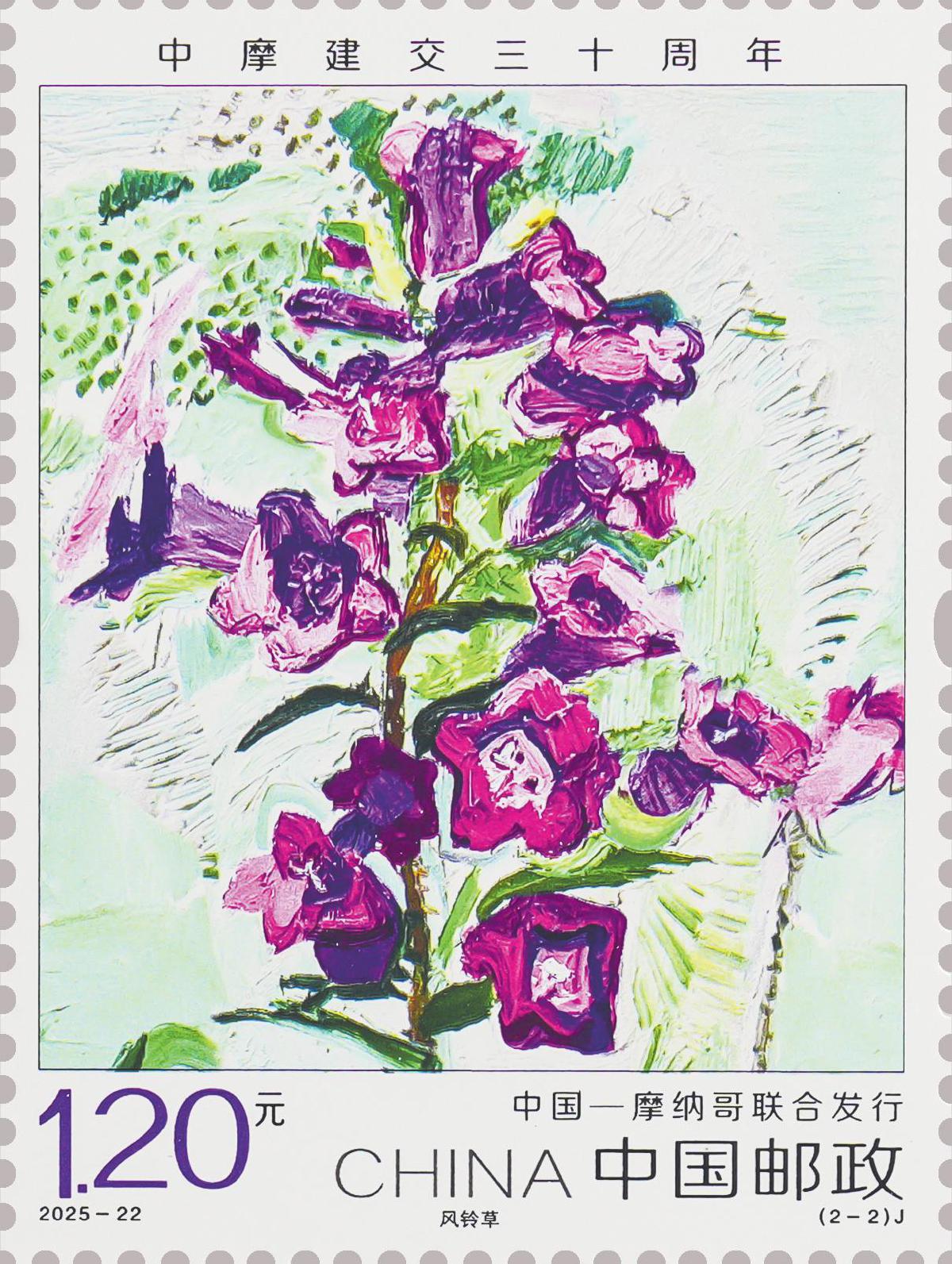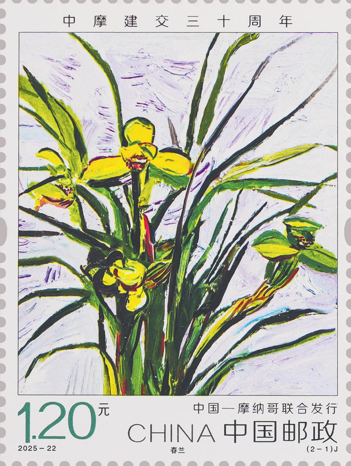 本套郵票分別選用具有兩國(guó)民族特色和深厚文化內(nèi)涵的花卉,中國(guó)選用栽培歷史悠久的春蘭,摩納哥選用美麗靈動(dòng)的風(fēng)鈴草,兩種花卉彰顯出生態(tài)文明的內(nèi)在價(jià)值與精神追求。郵票圖案采用油畫表現(xiàn)方式,設(shè)計(jì)師通過大膽的構(gòu)圖、恣意的筆觸、靈活的色彩搭配,對(duì)具體的物象進(jìn)行抽象提煉,從而營(yíng)造出一種生動(dòng)而富有生命力的畫面效果。兩枚郵票承載著“友誼長(zhǎng)存”的深層寓意,希望中摩關(guān)系不斷取得新進(jìn)展,更好造福兩國(guó)人民。
