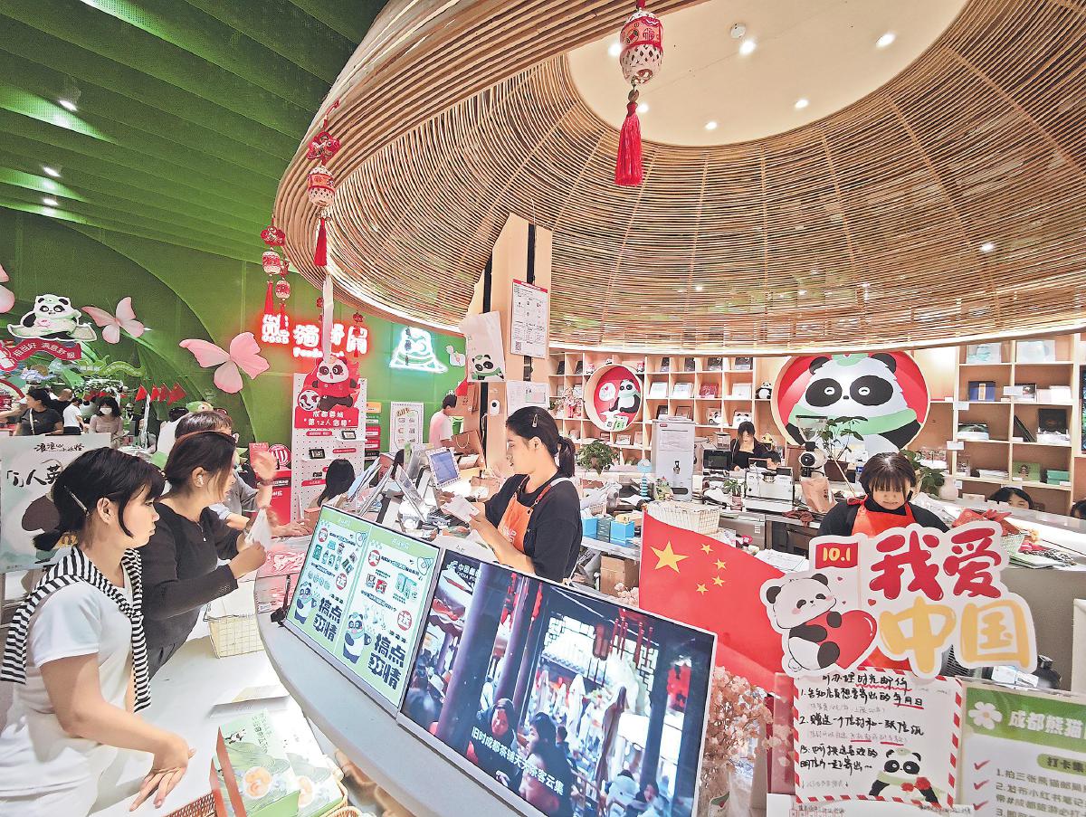 “蓋完這枚‘巴適’方言章,給女兒的國慶禮物就集齊了!”蘇州游客王先生手持“護(hù)照本”,在蓋章區(qū)加蓋紀(jì)念章。精心挑選明信片的顧客在千款圖案前流連忘返,咖啡區(qū)坐滿了手持熊貓主題飲品的游客,留言墻上貼滿了對祖國和成都的祝福語。這熱鬧的場景,正是熊貓郵局作為文創(chuàng)地標(biāo)影響力的生動體現(xiàn)。它不僅是一處郵政服務(wù)場所,更是連接傳統(tǒng)與現(xiàn)代、傳遞成都文化與熊貓文化的重要樞紐,讓每一份國慶心愿跨越山海抵達(dá)目的地,也讓成都的文化魅力隨著一枚枚熊貓郵戳傳播到世界各地。