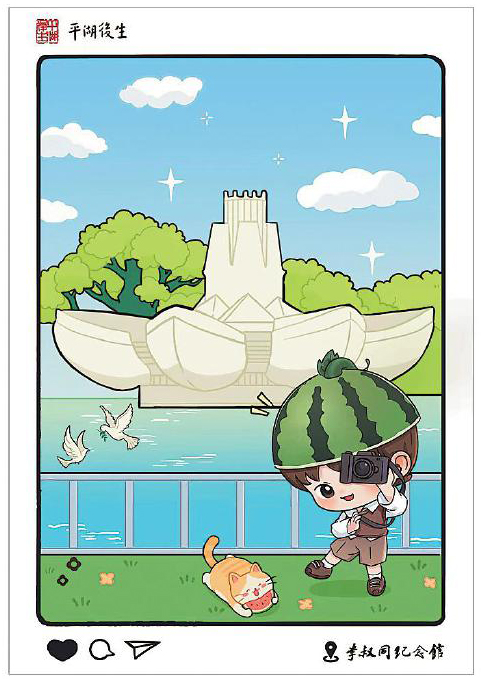 在項目推進過程中,設(shè)計團隊與平湖市委宣傳部進行了多輪溝通,最終獲得政府層面的認可與支持。設(shè)計構(gòu)思上,團隊深入挖掘平湖地方文化資源,注重將城市肌理與精神符號融入方寸之間。彩戳及手繪明信片的圖案不僅選取了當?shù)卮硇跃坝^,更著重突出了與一代文化巨擘李叔同相關(guān)的元素,如作為城市文化新地標的東湖李叔同紀念館。該紀念館于今年5月完成升級并重新開放,成為集中展示李叔同生平與藝術(shù)成就的重要窗口,也為彩戳、手繪明信片設(shè)計提供了豐富的視覺素材和內(nèi)涵支撐。手繪明信片還融入了卡通人物形象,貓咪與戴西瓜帽的動漫人物形象活潑俏皮,細節(jié)處滿是巧思。