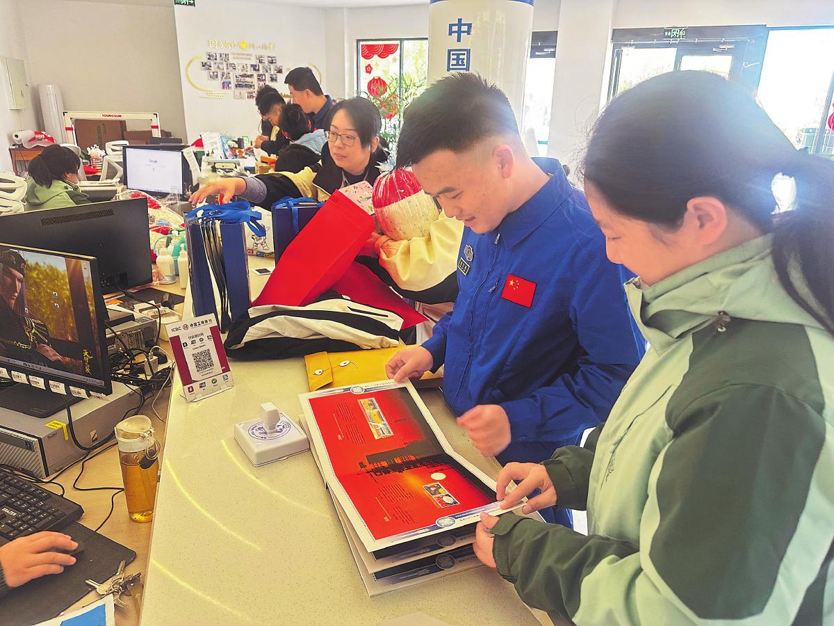 10月31日,搭載神舟二十一號載人飛船的長征二號F遙二十一運載火箭在甘肅酒泉衛(wèi)星發(fā)射中心成功發(fā)射。為記錄中國航天事業(yè)的輝煌成就,酒泉市郵政分公司推出“2025筑夢太空”系列郵品,既具有航天發(fā)射的紀念意義,又兼顧集郵愛好者關注的收藏價值,受到各界的歡迎。圖為在酒泉航天主題郵局,客戶們踴躍選購航天郵品。