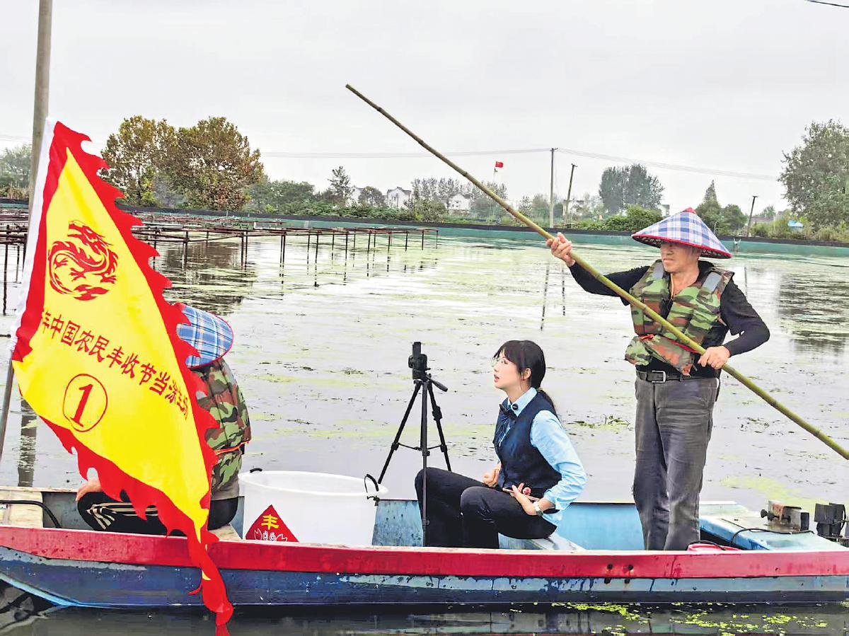 郵政在蟹塘邊開展直播,助力螃蟹銷售。