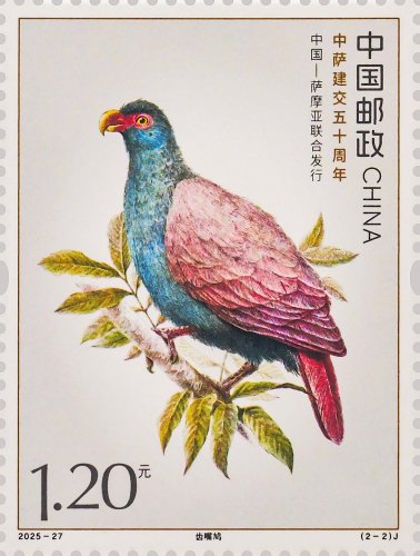 本套郵票以兩國的特色鳥類為核心設(shè)計元素,融西方鋼筆線條與東方淡彩的表現(xiàn)技法,筆觸細(xì)膩傳神,形象生動逼真,兩只禽鳥顧盼相應(yīng)、神氣貫連,洋溢著蓬勃的生命力。本套郵票既展現(xiàn)兩國獨特的自然生態(tài)之美,更傳遞出兩國友誼的深厚底蘊與美好未來。第一枚郵票表現(xiàn)了白馬雞。作為四川丹巴莫斯卡鳥類重要棲息地的主要保護物種,白馬雞也成為丹巴自然生態(tài)的鮮活代表,當(dāng)?shù)鬲毺氐母咴瓪夂?、適宜的生態(tài)環(huán)境為其提供了理想生存空間。第二枚郵票表現(xiàn)了齒嘴鳩。作為薩摩亞的本土特有鳥類,齒嘴鳩不僅是當(dāng)?shù)厣鷳B(tài)系統(tǒng)的重要成員,更被視為薩摩亞自然與文化遺產(chǎn)的象征,承載著薩摩亞人民對家鄉(xiāng)土地的熱愛與珍視。