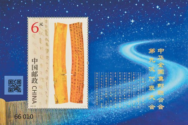 小型張圖案表現(xiàn)了“黑夫木牘”。該木牘1975年出土于湖北省云夢縣睡虎地4號秦墓,是目前考古發(fā)現(xiàn)的最早家書,延續(xù)了中華全國集郵聯(lián)合會大會系列郵票以郵驛文化元素為表現(xiàn)內(nèi)容的慣例。該家書由士兵黑夫與驚寫給兄長衷,信中講述了一些從軍細(xì)節(jié),還有對家人的關(guān)懷及衣物錢糧的需求。邊飾背景中展開的竹簡似一條時(shí)光長河,在象征中華文明的浩瀚星空里蜿蜒伸展,穿越千年、對話古今,蘊(yùn)含了中華文明在傳承中創(chuàng)新、在創(chuàng)新中發(fā)展的思想智慧。