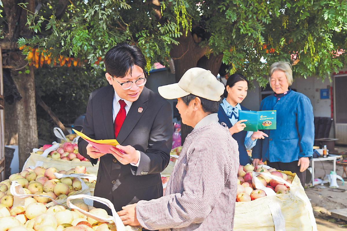 10月21日,沂源縣人民法院四級(jí)法官助理黃旭東和郵政工作人員一起在北店子村向果農(nóng)宣講法律知識(shí)。