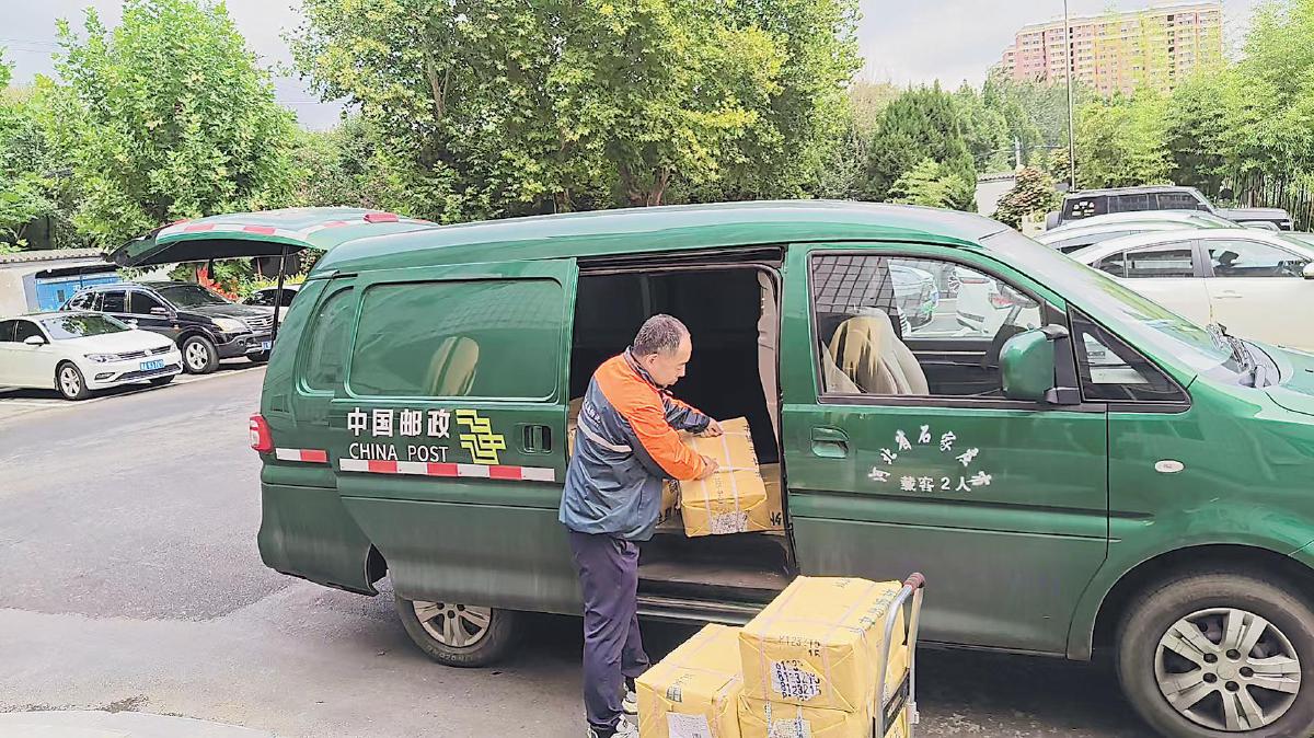 河北石家莊市分公司攬投員將重點政務(wù)圖書搬上郵車準備配送。