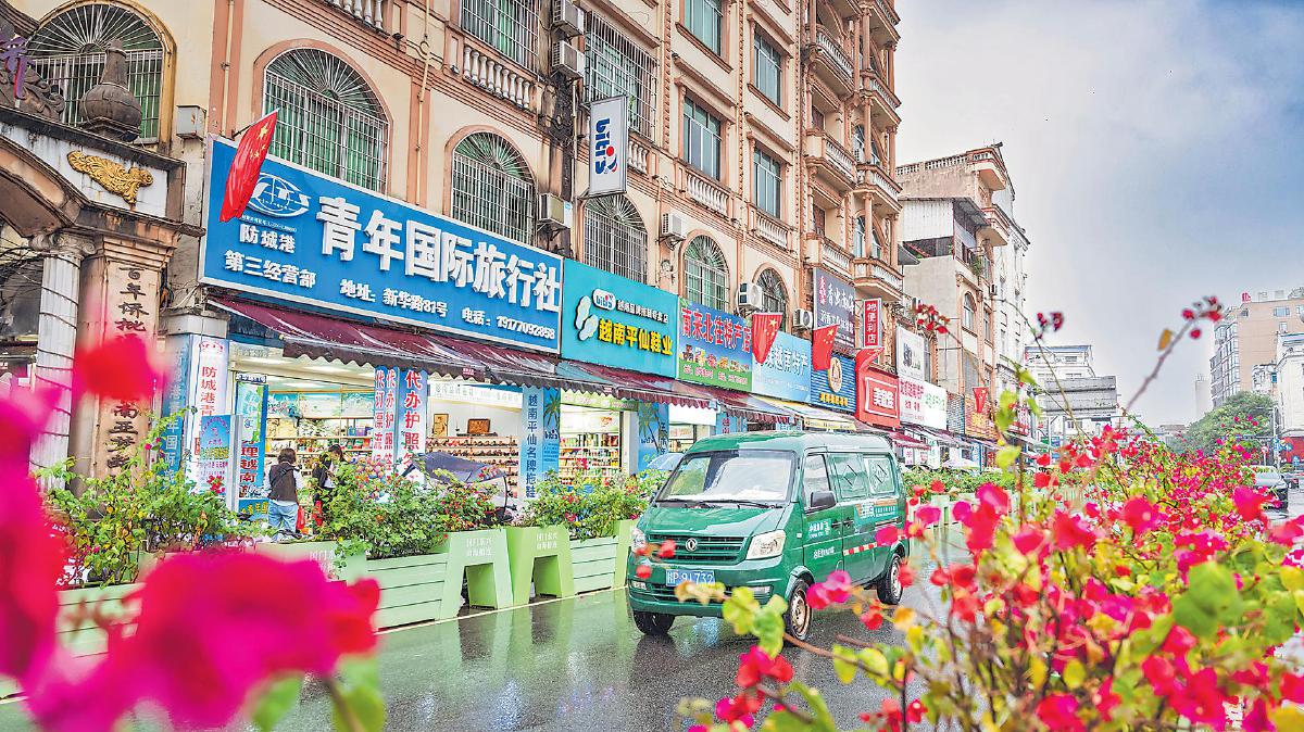 郵車穿行于東興市邊貿(mào)街區(qū)的商鋪間。