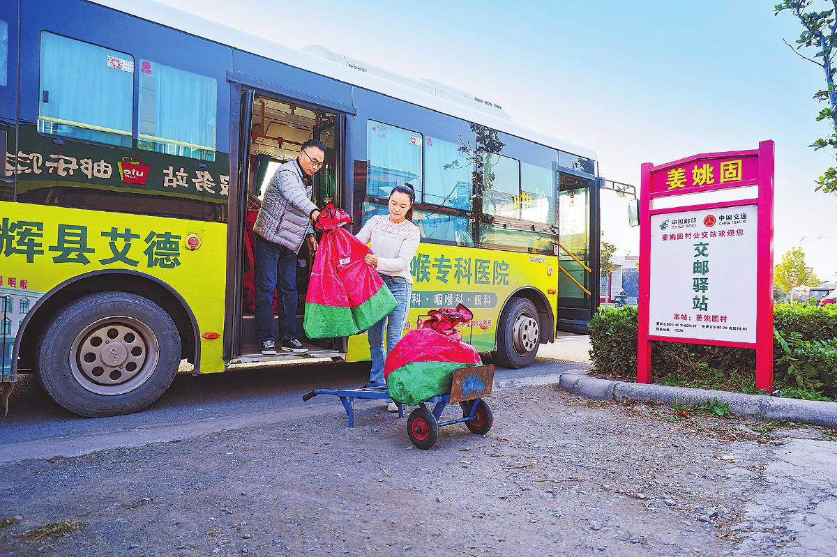 在輝縣市寄遞物流共配中心,郵政員工登上公交車整理代運(yùn)郵件。