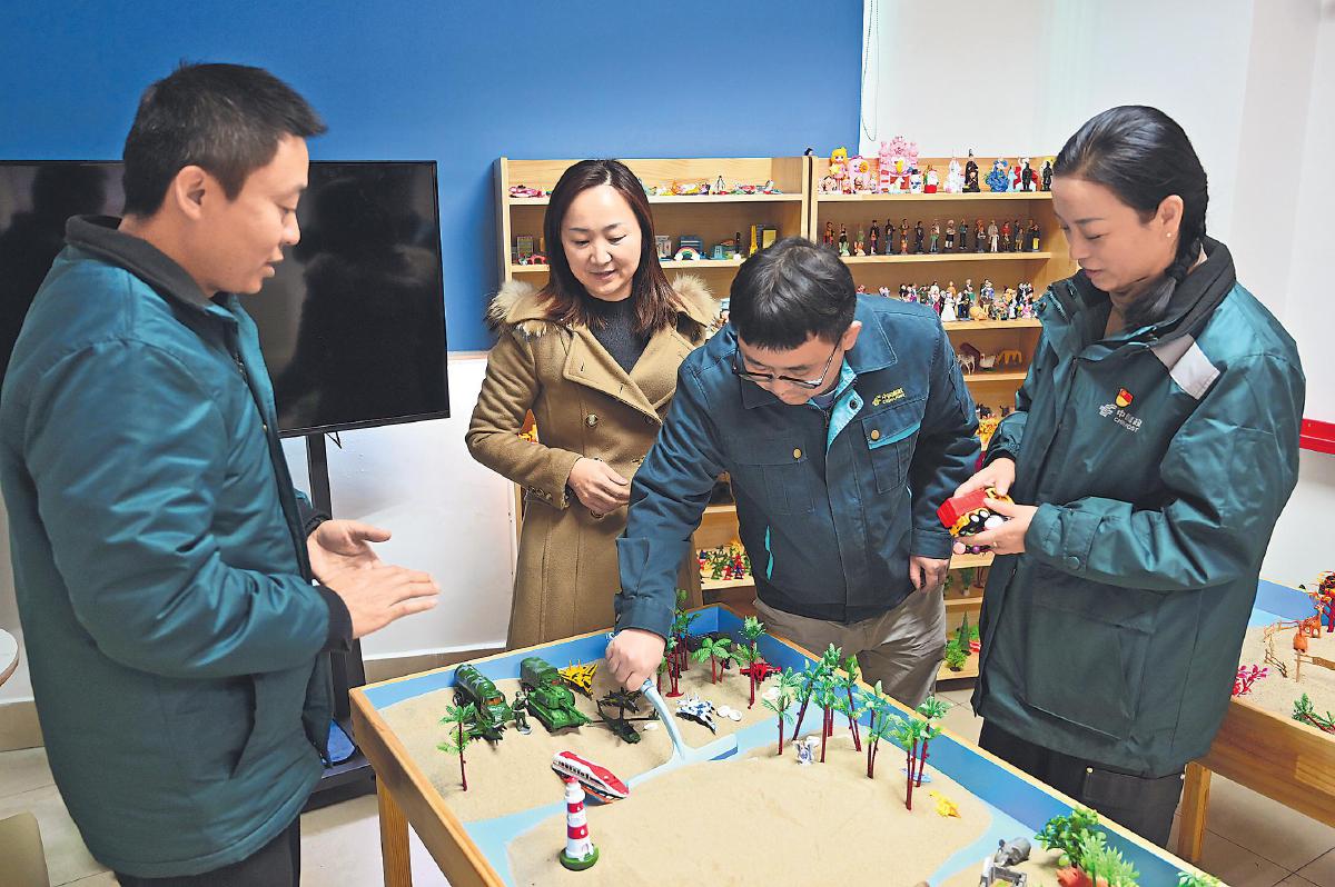 在昆明郵區(qū)中心,心理導(dǎo)師向員工介紹“心理沙盤(pán)”的使用方法。 □趙焱 攝