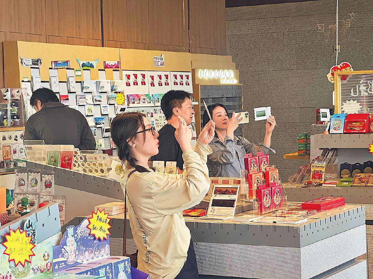 游客在長博郵局手持“長城之窗”明信片拍照打卡?!豕蟆z