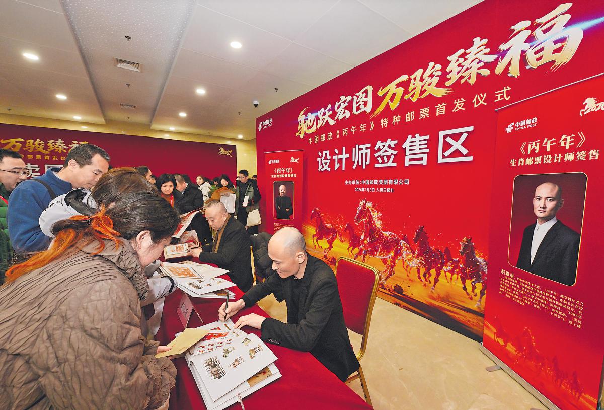 《丙午年》特種郵票設計者王紅衛(wèi)、趙恩重在首發(fā)儀式現場為郵迷簽售?!踔煺x 攝