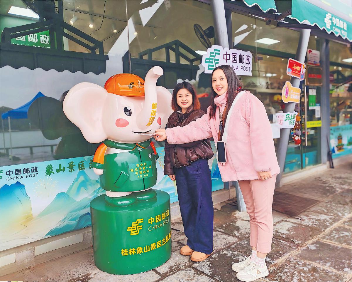 廣西壯族自治區(qū)桂林市郵政分公司在象山景區(qū)主題郵局舉辦首發(fā)活動,免費為市民、游客提供生肖紀念戳加蓋服務。圖為游客將蓋好戳的明信片投入郵筒寄出?!跆扑仄肌↑S賢明 攝影報道
