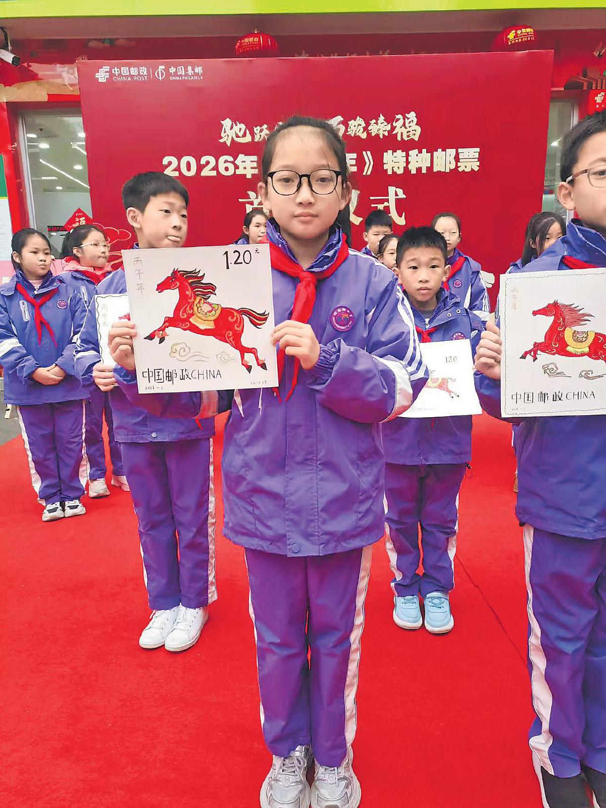 在重慶市永川區(qū)人民東路郵政支局,該市興龍湖小學師生代表繪制了自己心目中的馬年生肖郵票?!皡⒓舆@種活動,好玩又有意義?!币晃猾@獎學生舉著作品,滿臉自豪。□谷焱 攝影報道