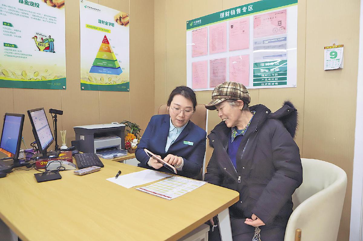 連云港市城區(qū)分公司理財(cái)經(jīng)理向客戶介紹理財(cái)產(chǎn)品。