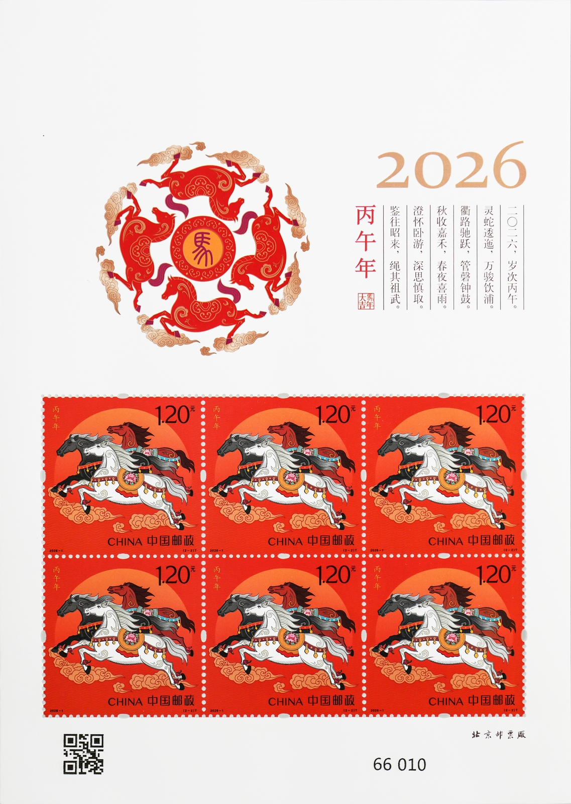 注:同時(shí)發(fā)行《丙午年》郵票版式三(整張枚數(shù):2套4枚;整張規(guī)格:120×160毫米;邊飾設(shè)計(jì)者:劉喜飛;對(duì)聯(lián)作者:常江)。計(jì)劃發(fā)行數(shù)量:288萬(wàn)版。用于贈(zèng)送給預(yù)訂2026年全年紀(jì)特郵票的預(yù)訂戶。