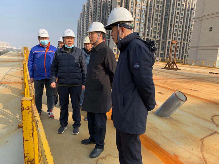 李兵董事長聽取了項(xiàng)目建設(shè)情況匯報,隨后來到轉(zhuǎn)體橋鋼箱梁上查看6號墩施工進(jìn)展。李董事長肯定了項(xiàng)目參建單位在平安花園騰退施工段面后搶抓工期取得的進(jìn)展,他要求參建單位按照2021年9月份主線橋完工通車的目標(biāo)倒排工期,同時加快輔道橋施工,再為南湖地區(qū)打通一條進(jìn)出通道。
