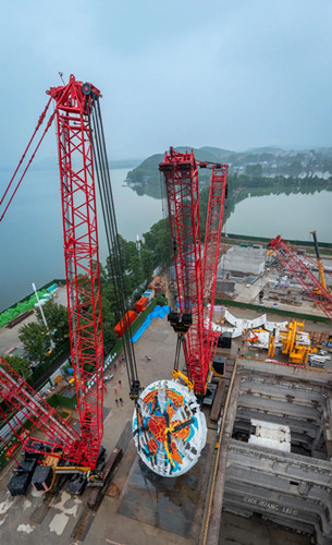 清晨7時(shí)許,涂裝了“龍鯉入漢”圖案的巨型刀盤在1臺(tái)800噸履帶吊和1臺(tái)450噸履帶吊的精準(zhǔn)配合下順利翻身。兩臺(tái)履帶吊車如同兩個(gè)“大力士”,合力架著重達(dá)613噸的盾構(gòu)機(jī)刀盤緩緩移動(dòng),進(jìn)行起吊前的最后調(diào)試工作。在歷經(jīng)起吊、翻身、旋轉(zhuǎn)等一系列操作后,下午1時(shí)30分左右,“東湖號(hào)”盾構(gòu)機(jī)刀盤安全、精準(zhǔn)地吊裝至井下安裝。