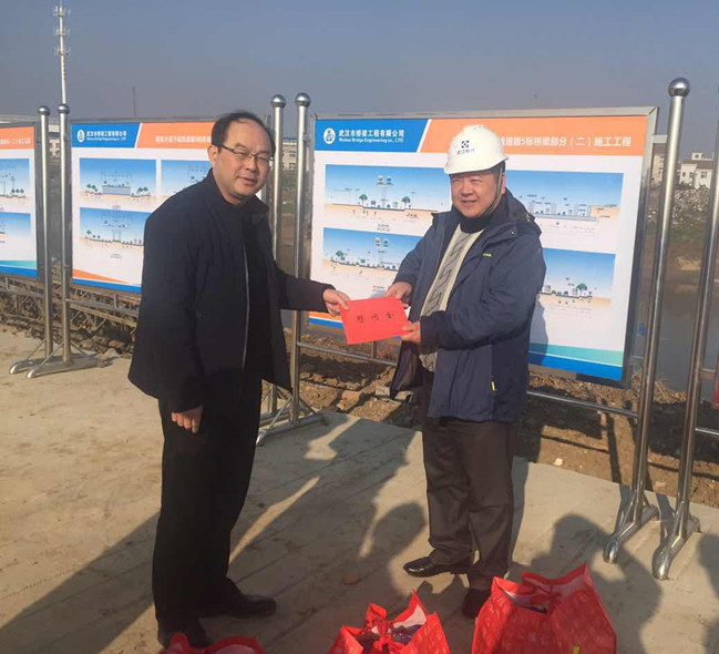 1月26日上午,市城投集團(tuán)公司領(lǐng)導(dǎo)汪國圣一行來到我公司負(fù)責(zé)代建的解放大道下延線工程現(xiàn)場,為春節(jié)期間仍堅(jiān)守在工作崗位上的工程建設(shè)者送去新春的祝福和節(jié)日的問候,并送去慰問金和節(jié)日物資。